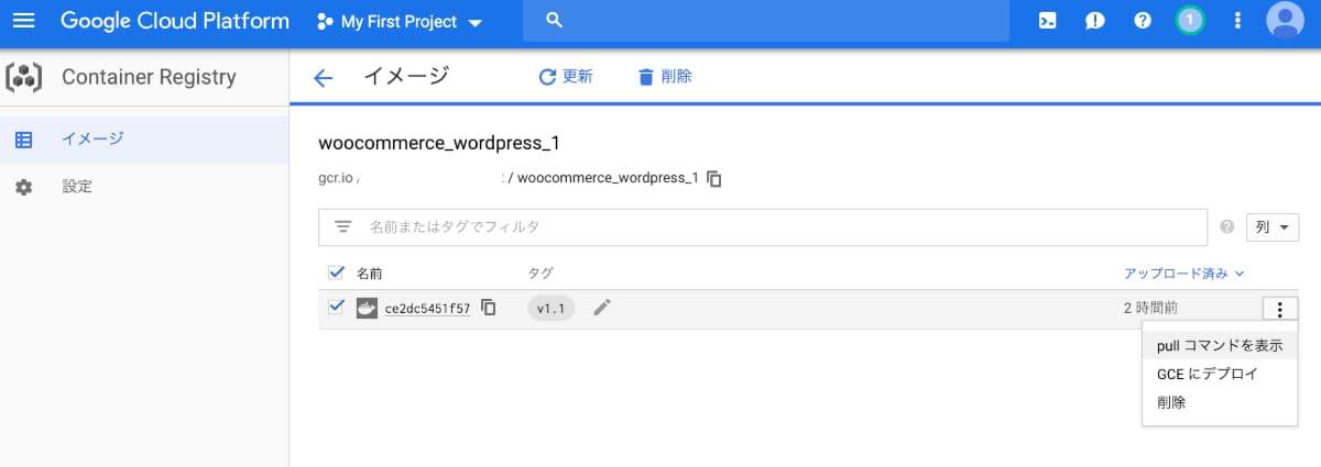 「pullコマンドを表示」だけでなく「GCEにデプロイ」という魅力的なメニュー。試してみようとしましたが、新しいインスタンスをもう一つ作ることになるようです。