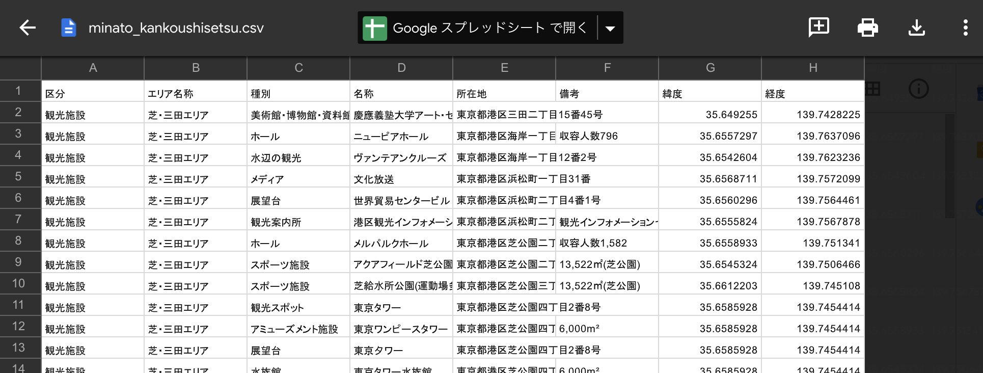 今回は、「港区観光施設」データを使用してみます。
