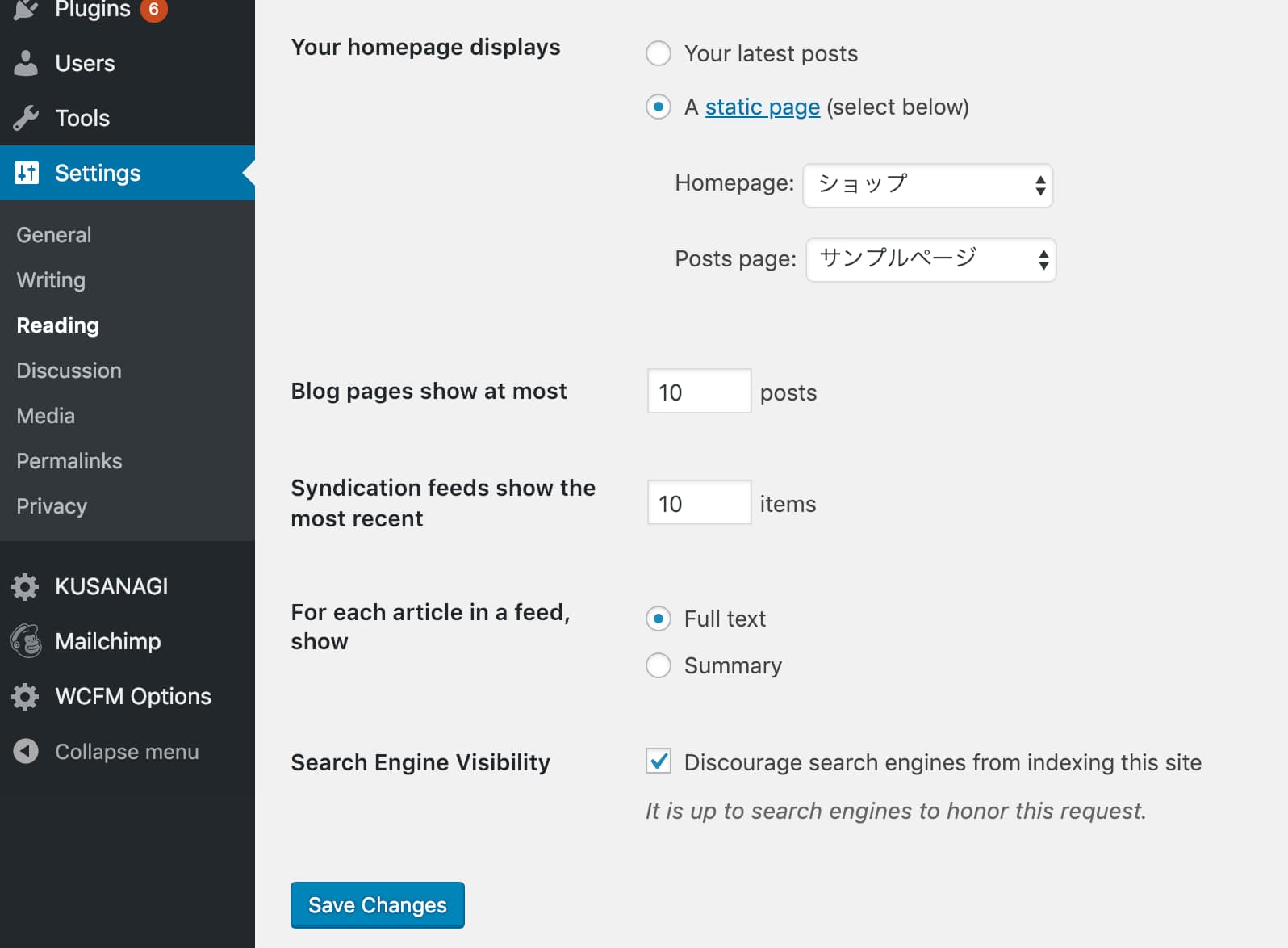 設定画面のReadingから「Homepage」にショップページを指定します。
